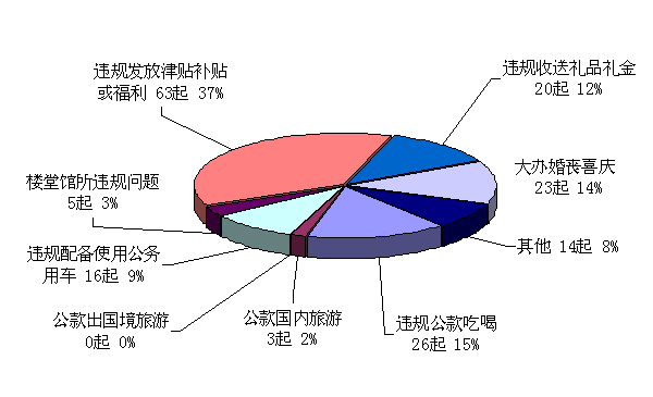 2017年一季度,甘肃省各级纪检监察机关共查处“四风”问题170起,处理279人,处分156人。从查处类型看,违规发放津贴补贴或福利63起,占查处问题总数的37%。其次为违规公款吃喝、大办婚丧喜庆,分别占查处问题总数15%、14%。从查处人员来看,厅局级干部4人,县处级干部26人,乡科级及以下干部249人。