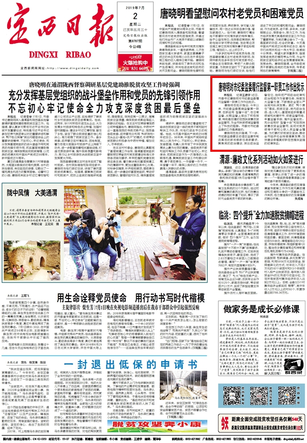 唐晓明在批示指出,今年以来,市纪委监委围绕监督第一职责,创新运用“监督十法”,在日常监督、长期监督上做出了积极探索,特别是创建的定西扶贫惠农资金监管网,为全市扶贫领域监督插上了科技的翅膀。市委对市纪委监委的工作是满意的。