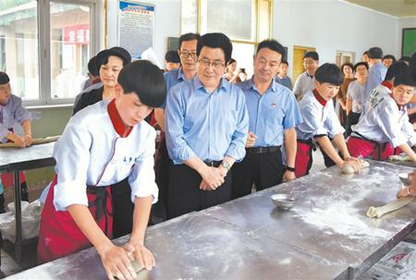 东乡县职业技术学校里,学生们正在接受特色美食培训。林铎来到学生中间,了解他们的学习生活情况,勉励大家学好手艺,掌握一技之长。他说,东乡县发展餐饮业有传统、有基础,市场潜力大,要尊重农民群众意愿,因人施教、因材施教,做好技能培训与市场和劳务公司的对接,拓宽贫困群众增收渠道。