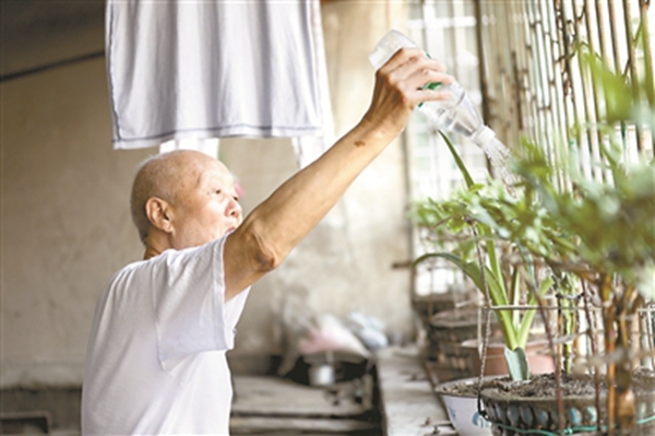 采访间隙,张富清到阳台上浇水,记者才注意到,阳台上的不少花盆是张富清用用过的抗生素小瓶一圈圈绑起来做成的,而浇水的花洒则是盖子上直接扎了几个眼的旧矿泉水瓶。