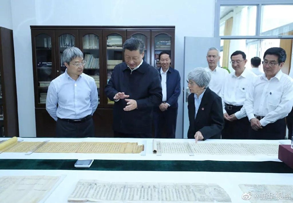 习近平总书记19日下午来到敦煌研究院,察看珍藏文物和学术成果展示,并同有关专家、学者和文化单位代表座谈。