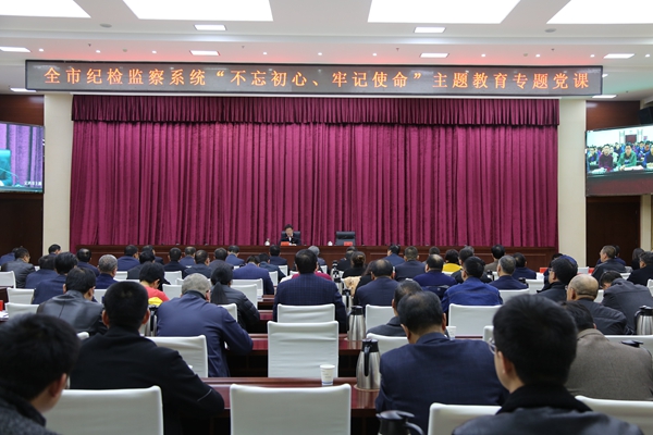 11月4日下午,全市纪检监察系统“不忘初心、牢记使命”主题教育专题党课在市政府二楼会议室举办。