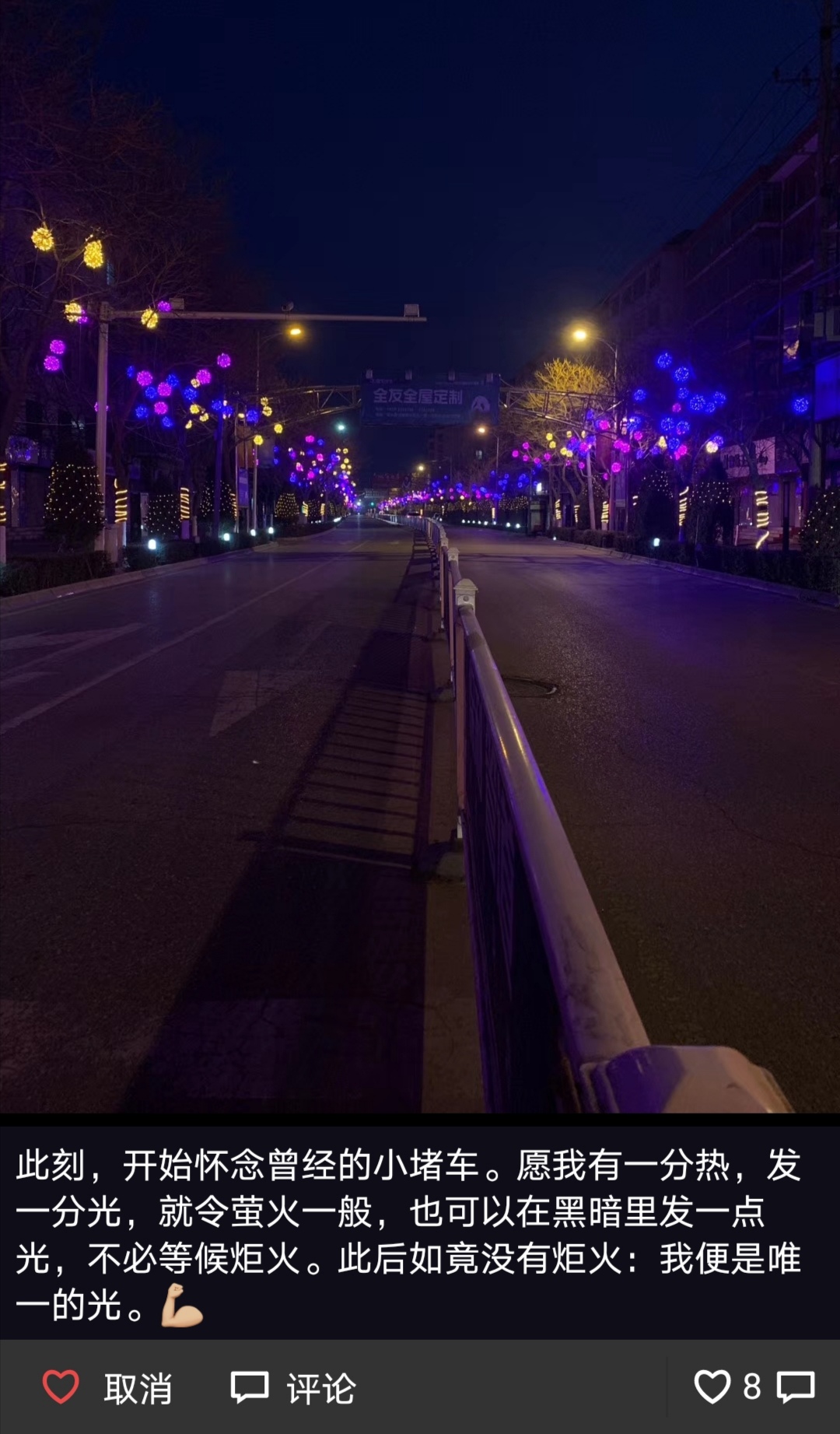 此刻,“女侠”开始怀念这条街道车水马龙的模样,怀念曾经抱怨过这座城市堵车的热闹情景。这个元宵节,她祈祷疫情快快结束,国泰民安,四海升平。