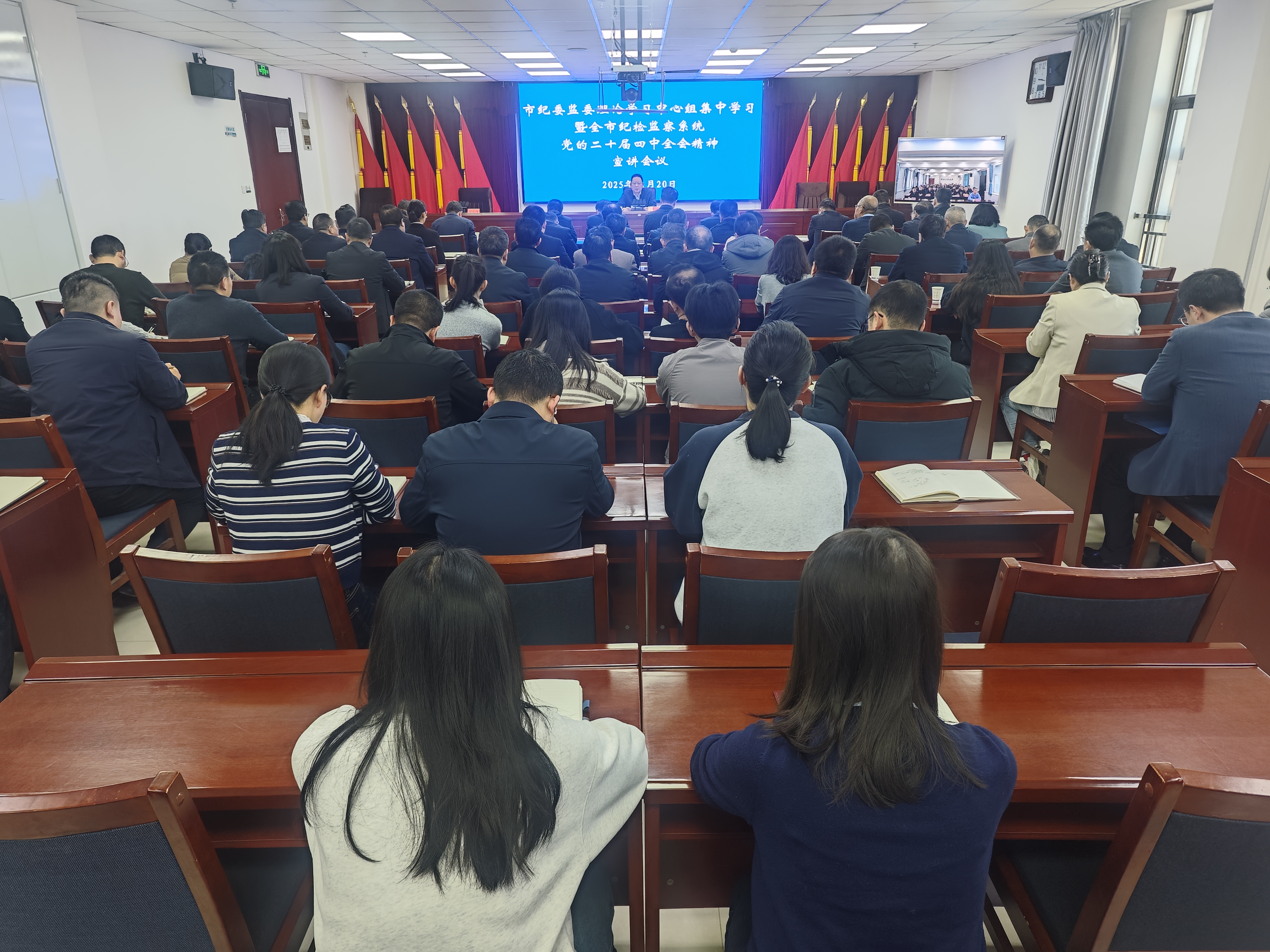 11月20日,市纪委监委理论学习中心组集中学习暨全市纪检监察系统党的二十届四中全会精神宣讲会议召开。市委常委、市纪委书记、市监委主任洪星主持会议并宣讲党的二十届四中全会精神。